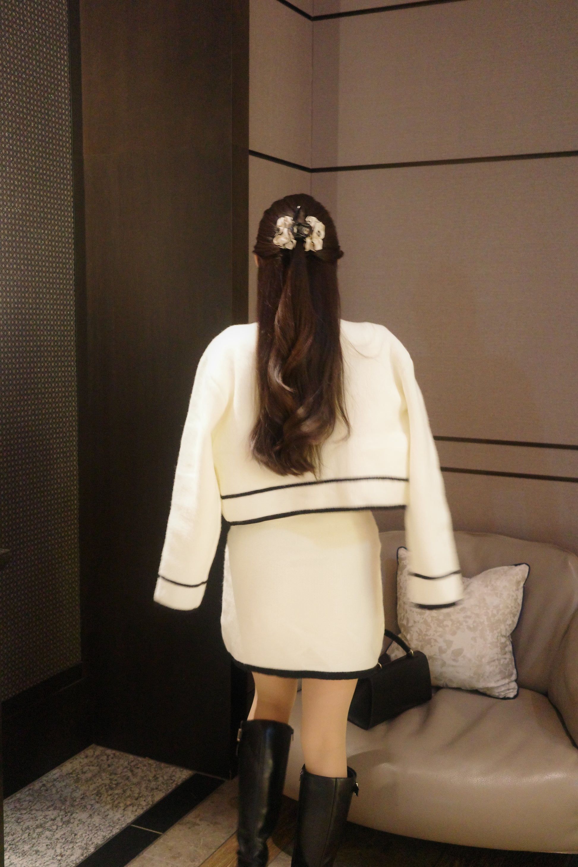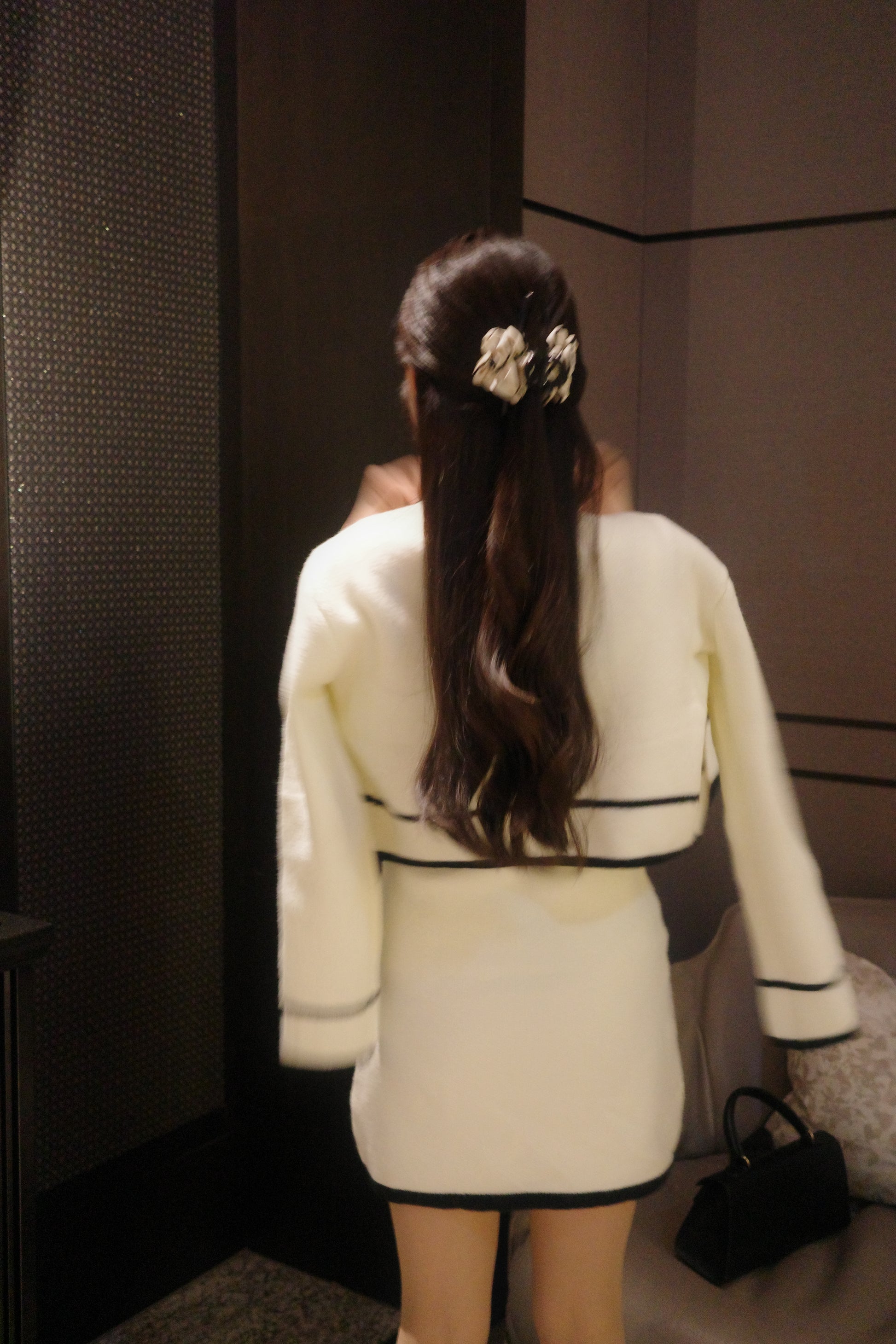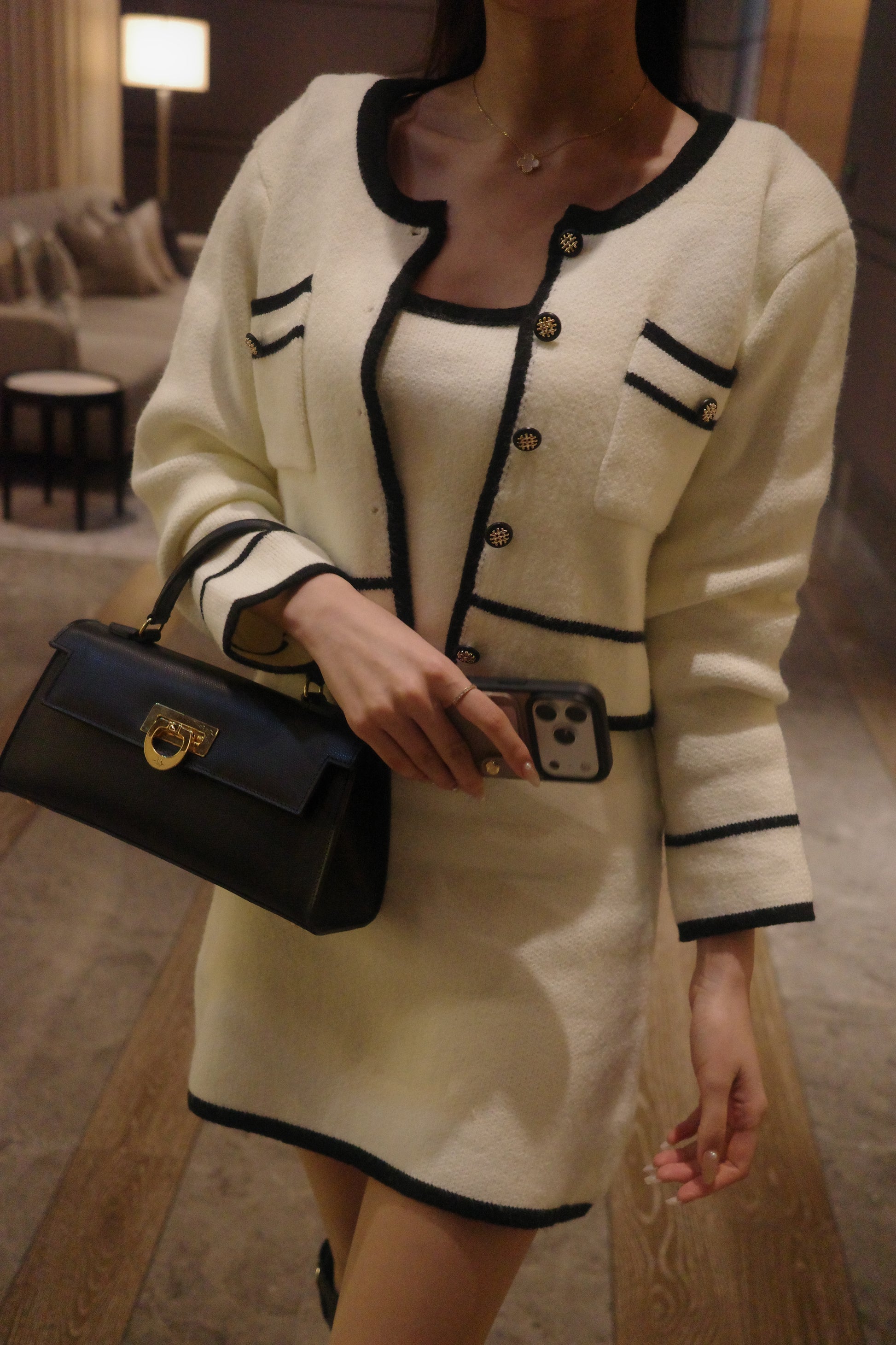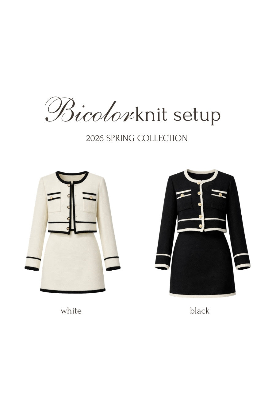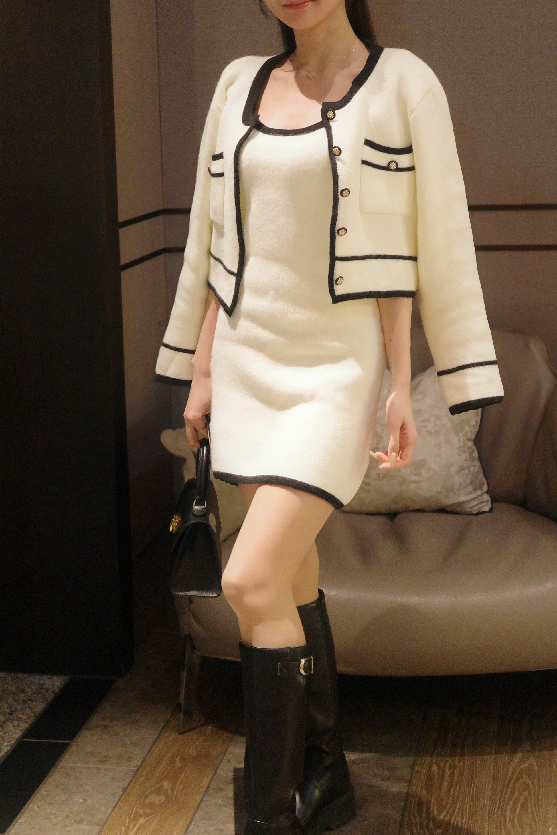配色が映えるバイカラーデザインのニットカーディガンと、ミニ丈ワンピースを組み合わせたセットアップ。コンパクトなシルエットながら、全体をすっきりと見せ、洗練された印象に仕上げます。ミニ丈でありながら、落ち着きのあるデザインと素材感により、上品さをキープ。セットで着用すれば統一感のあるスタイリングが完成し、それぞれ単品でも着回しが楽しめます。程よくトレンドを取り入れつつ、甘くなりすぎないバランスが魅力のセットアップです。
