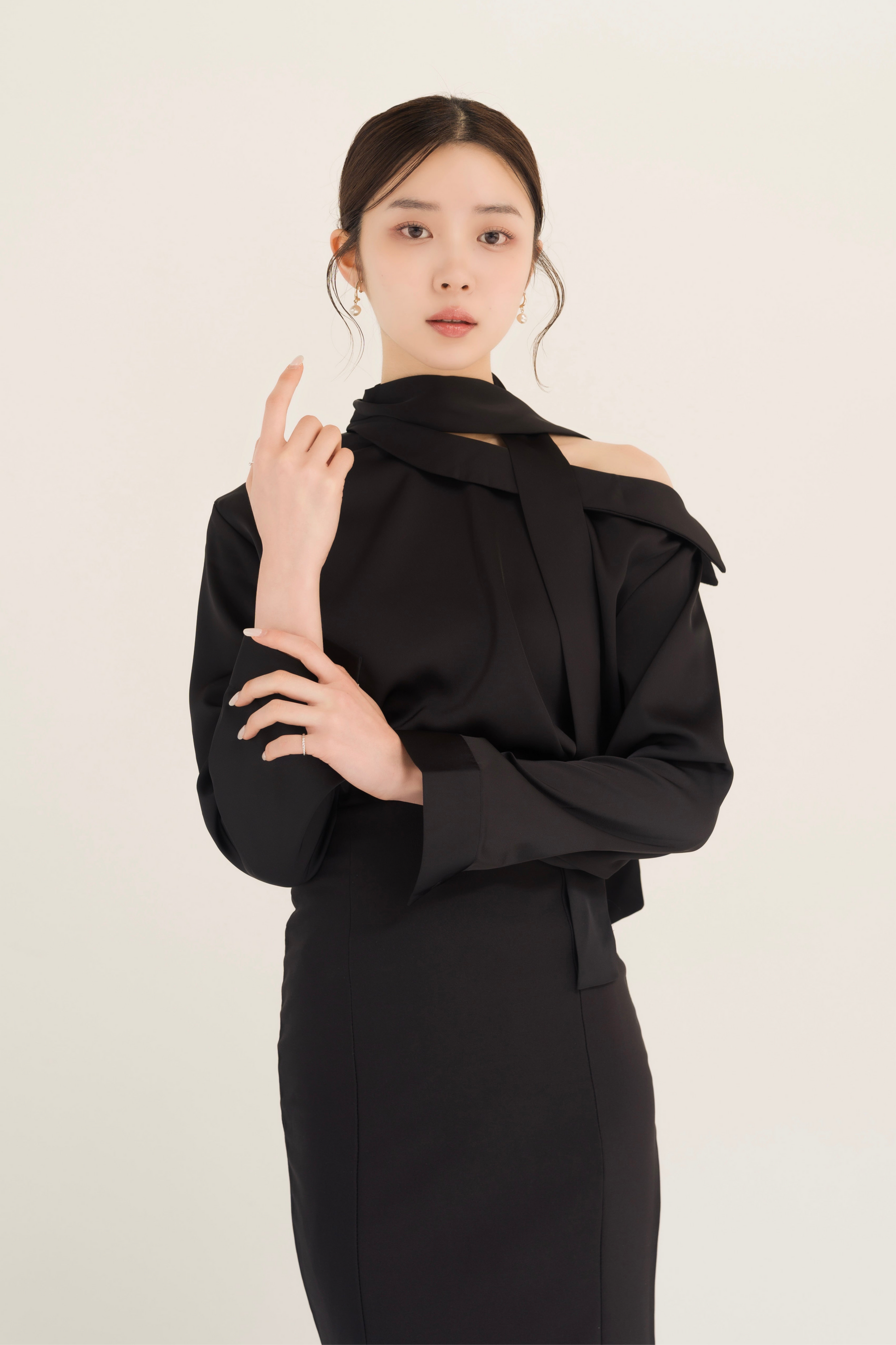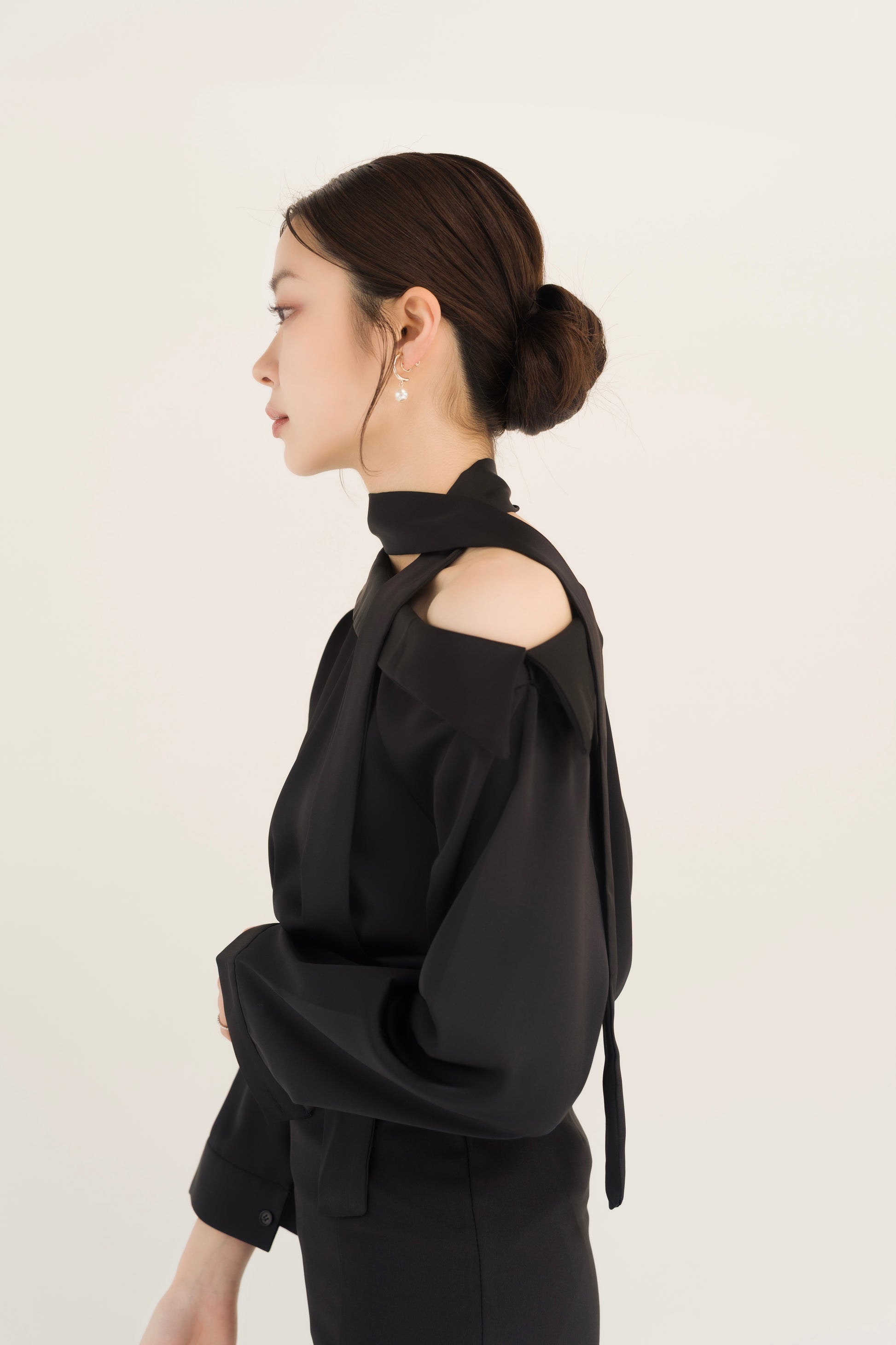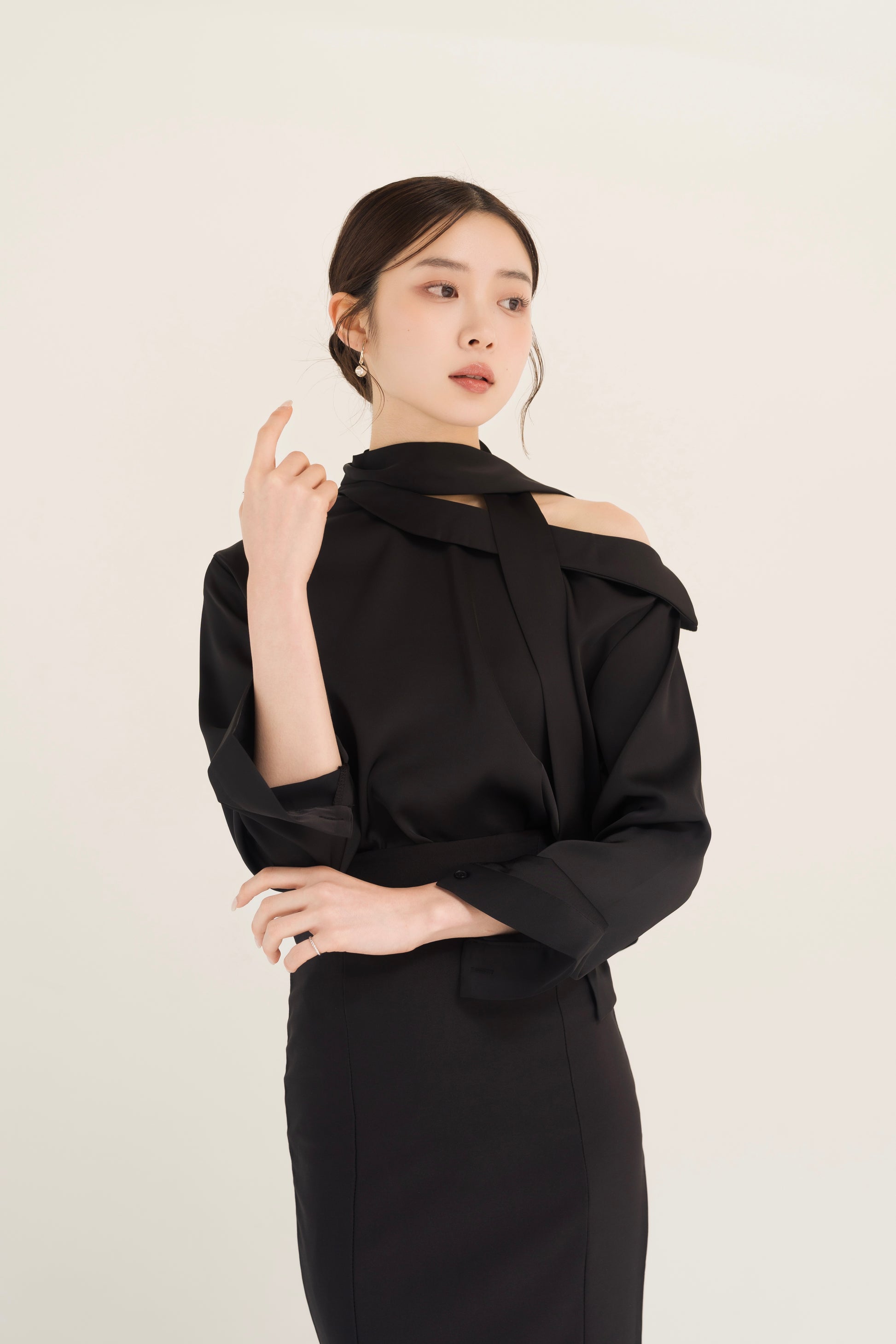 なめらかなツヤ感が美しいサテン素材を使用した、アシンメトリーデザインのブラウス。片側の肩が覗くシルエットが、抜け感のある女性らしさを演出します。首元にはタイデザインをあしらい、甘さを抑えた大人かわいい印象に。華やかさがありながらも上品にまとまり、スタイリングを程よく格上げしてくれます。一枚で主役になる存在感があり、スカートにもパンツにも合わせやすく、オン・オフ問わず活躍する一着。洗練されたデザインで、大人の余裕を感じさせるブラウスです。